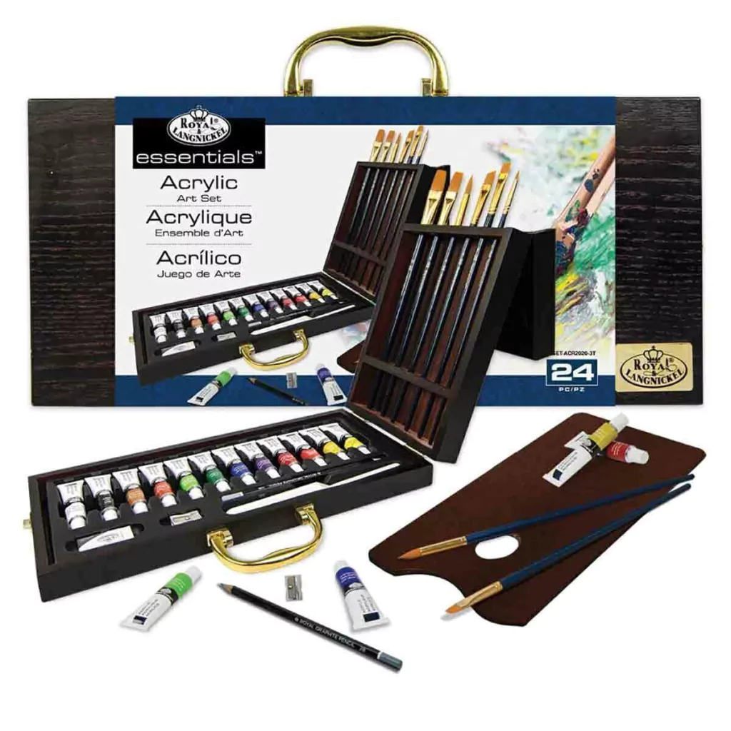 Nossos conjuntos de arte para caixa de pincéis Premium mantêm os materiais de arte e pincéis limpos e organizados em uma caixa de madeira durável. A caixa vem cheia de materiais de arte, pincéis e ferramentas de qualidade premium selecionados à mão, bem como um Guia do Artista com dicas e técnicas.