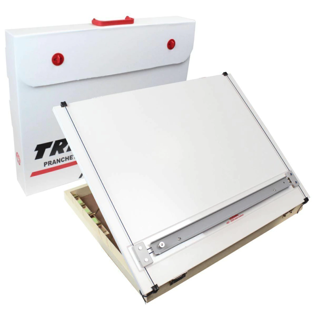 Prancheta Para Desenho com Régua Paralela A3 Trident. A Prancheta Para Desenho com Régua Paralela A3 Trident é um estojo de madeira, finamente acabado, com espaço para guardar papéis e acessórios para desenho. Seu tampo permite regulagem da inclinação e já vem equipado com régua paralela. Para facilitar o transporte e proteger a régua paralela, o conjunto vem acondicionado em estojo polionda com alça para facilitar o transporte. 5000 Medidas externas: 42 x 52 x 4,5 cm Ângulos de inclinação da prancheta: 15º, 30º, 40º e 45º