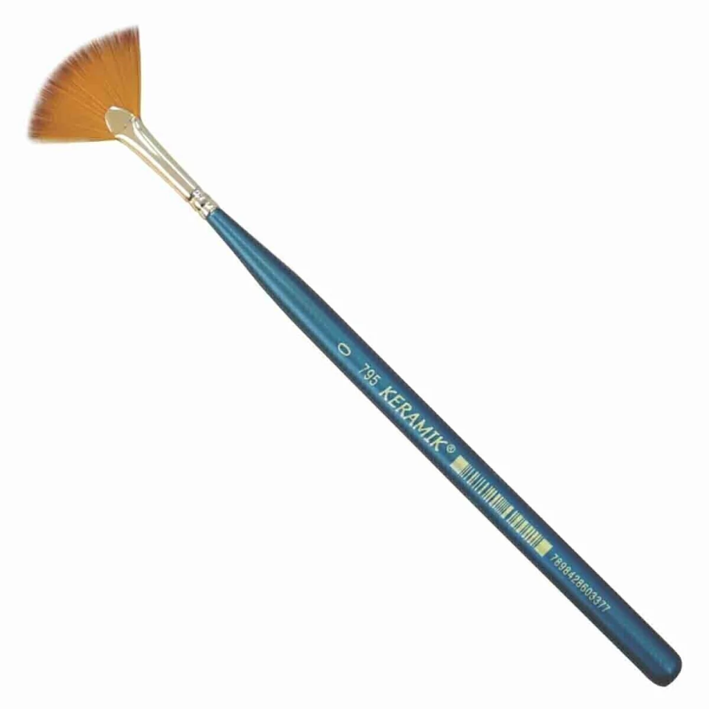 Pincel Keramik 795, é um pincel de pintura de formato Leque, cabo curto cilíndrico em madeira e pelo sintético bicolor. O formato cilíndrico do cabo do pincel leque 795, torna o manuseio mais agradável, e os pelo sintéticos flexíveis produzem traços fluídos com precisão. O Pincel Keramik 795 pode ser utilizado para pintar tonalidades diversas e criar sombreados. É possível obter traços especiais utilizando somente as pontas, criando desenhos texturados, como na pintura de árvores, grama, cabelos. A Linha Premium do Pincel Keramik, foi especialmente projetado para proporcionar os melhores resultados em diversas técnicas artísticas, é indicado para pintura aquarela e acrílica.