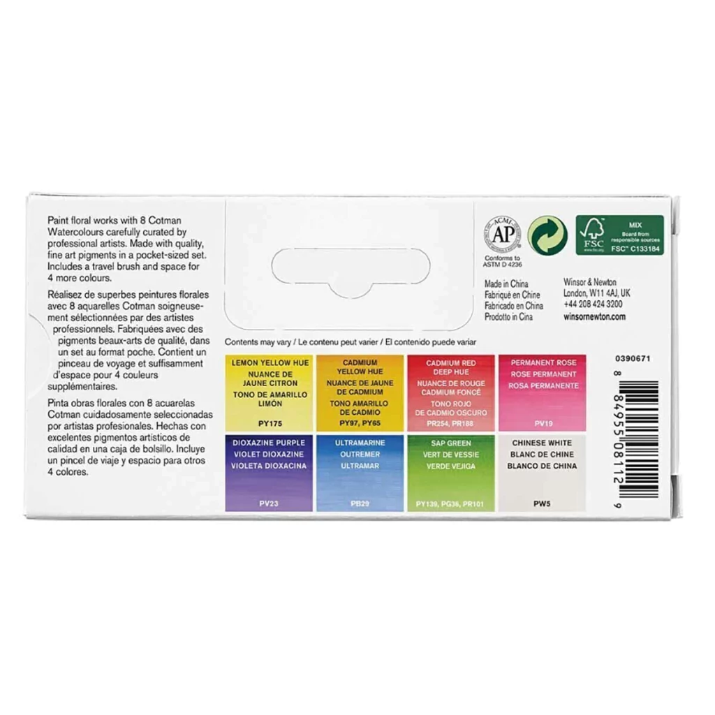 Estojo de Aquarela Winsor & Newton Cotman Pocket FLORAL é composto com uma seleção de cores direcionadas para a pintura de "Flores"
